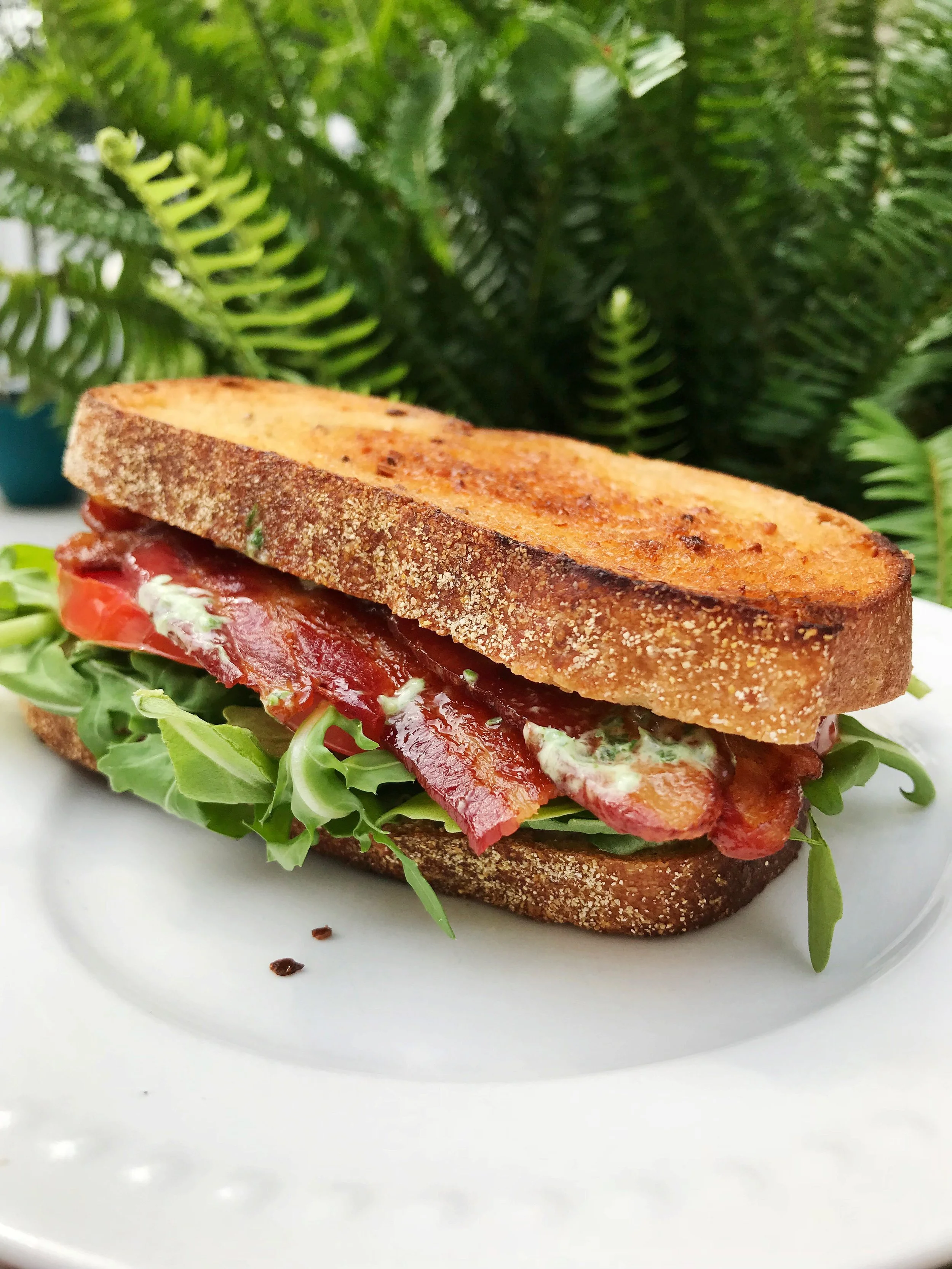 5. Assemble your BLT by spreading a generous amount of the basil aioli on each slice. Top one slice with a handful of the arugula and the other with bacon. Layer two or three slices of tomato over the arugula. Serve warm or at room temperature.